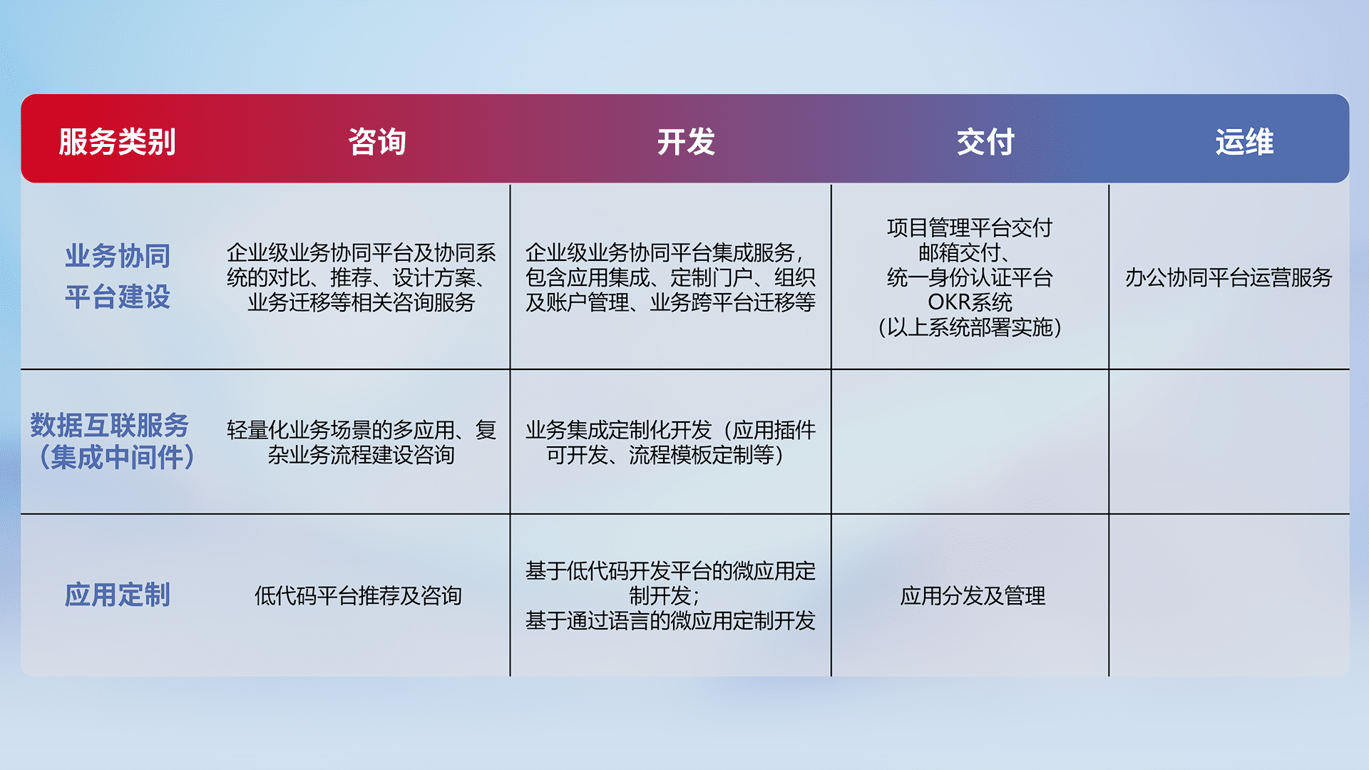 针对钉钉、、、企微、、IDaas等平台级产品提供产品的规划、、、、方案、、、、交付、、定制化开发等服务,,实现如统一协同办公、、、、智能客户服务、、混合会议管理、、、智能数据查询、、等业务场景,,,,实现数字化转型。。。