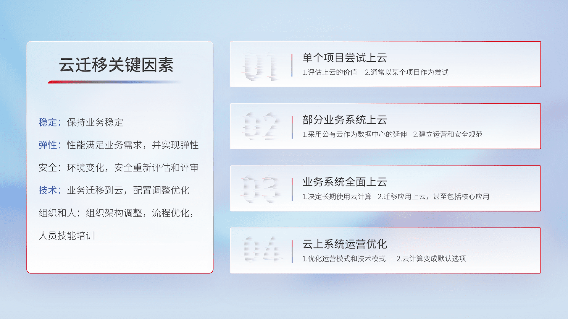 结合实际业务,,,从规划设计、、云平台选型、、、、云原生改造、、、、数据迁移、、集成交付,,,迁移全过程为客户识别最佳上云路径,,,做好风险识别管理,,,,设计网络架构、、身份权限、、、安全审计合规、、、操作审计、、、、日志审计、、监控告警策略、、、、多站点容灾设计等,,,对云上基础设施进行整体规划,,提升IT治理水平,,以满足弹性、、高可用、、高性能的需求。。。
