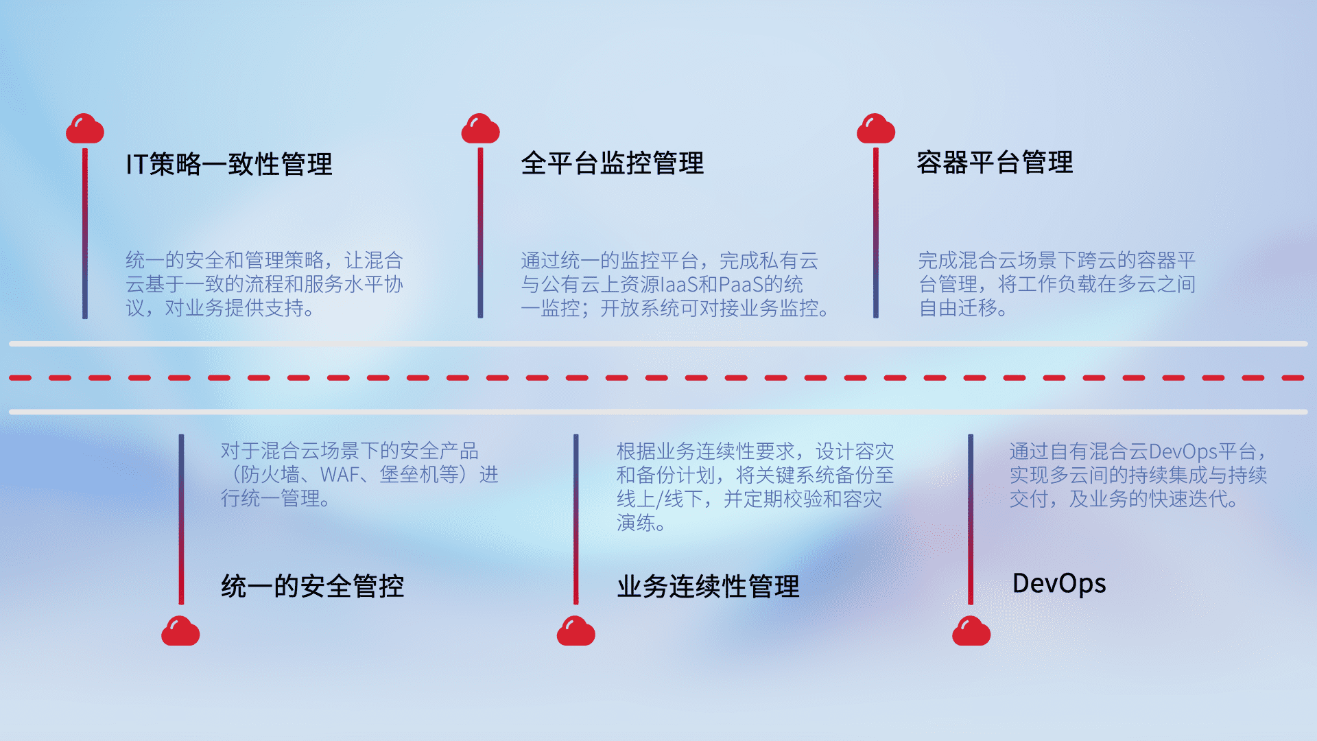 通过多云纳管,,,,以统一的资源数据模型把客户的云资源进行抽象和封装,,,,进而实现对多云资源的统一操作,,保障云资源管理的可靠性、、、稳定性与可用性。。。。量身定制化运维内容,,,配置、、开发运维、、补丁管理、、备份、、、、监控、、认证和访问管理、、、、审计和日常巡检等,,,保障在用云过程中的可靠度,,,稳定度以及高可用率。。。