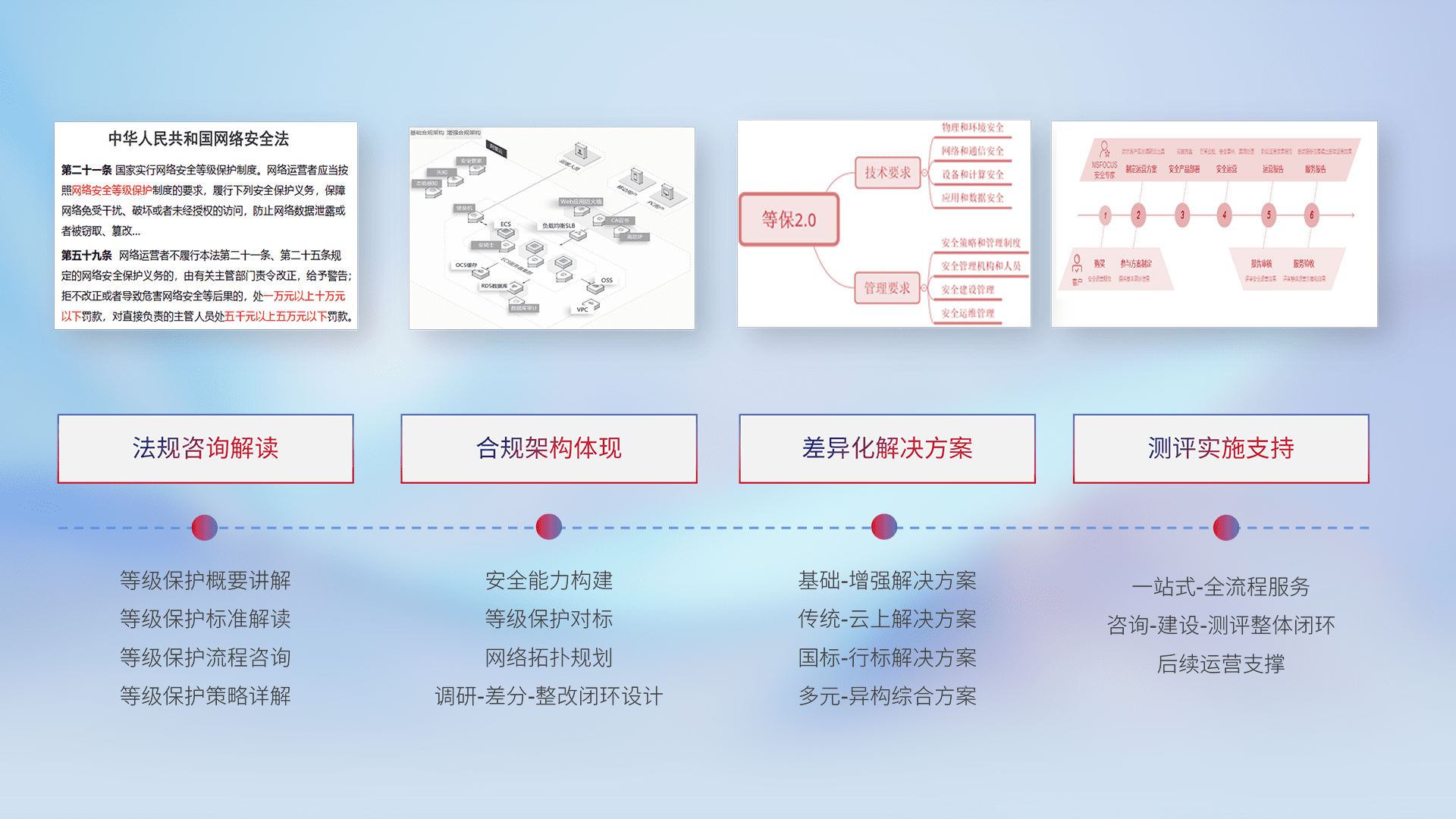 通过专业的法律咨询解读、、、合规架构体现、、、、差异化解决方案、、测试实施支持等服务,,为客户量身打造等保合规体系。。